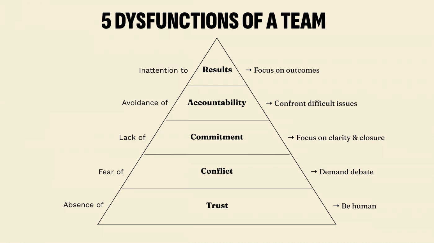 As a summary for all the above statements, we love to bring up the idea of the book The 5 Dysfunctions of a Team, which clearly outlines how trust is the needed foundation to step up to exceptional results. When you never invest in the trust layer, you will have a hard time getting the results your company needs. And relationship-focused 1:1s are one controllable instrument to build trust in your relationships.