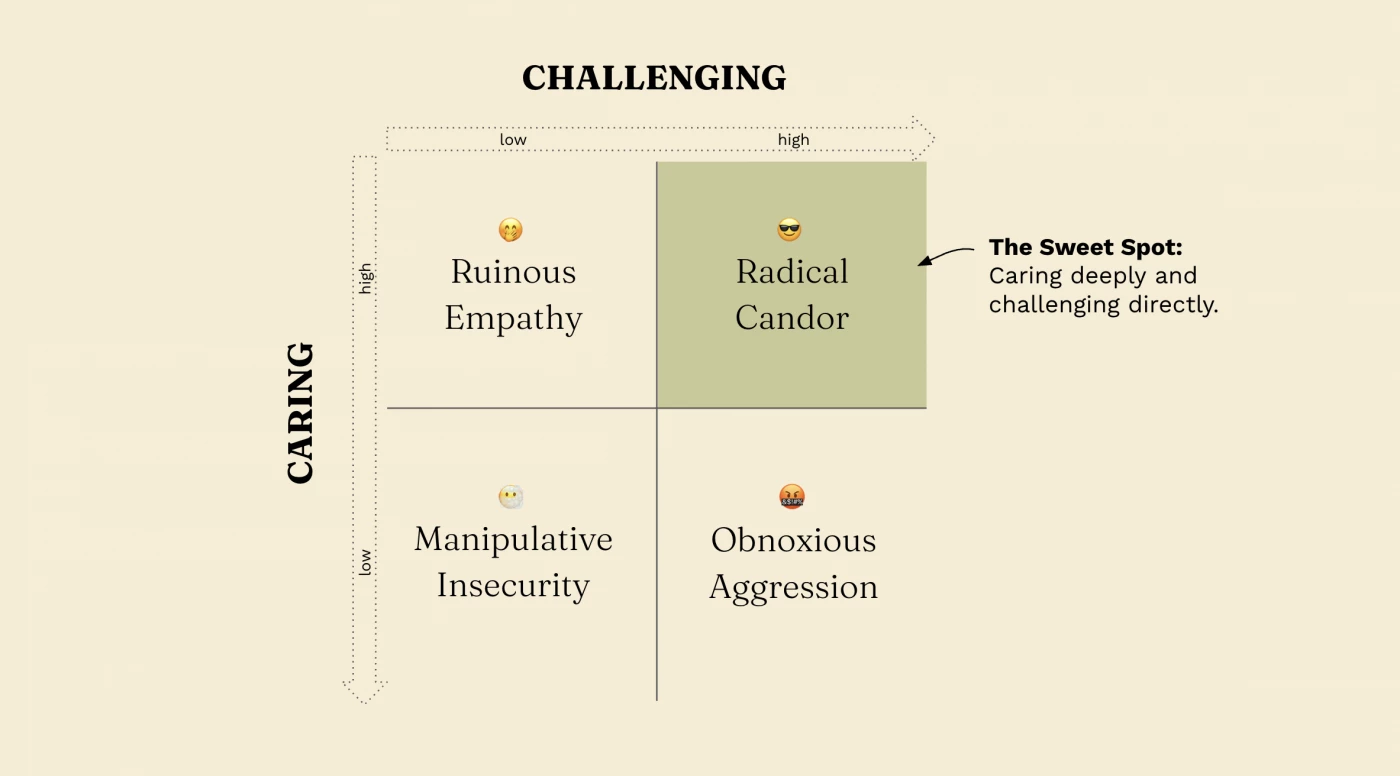 Radical candor [1] is caring personally and challenging directly at the same time. Most leaders tilt one way. They protect feelings and avoid the truth. Or they tell the truth in a way that harms the relationship.